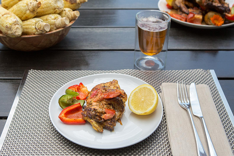 Heat grill to 500 degrees, keeping grill covered. Remove excess marinade before adding chicken to the grill. Cook chicken for 25-30 minutes, turning chicken often to cook evenly. Optimal temperature is 165 degrees. Serve with corn on the cob.