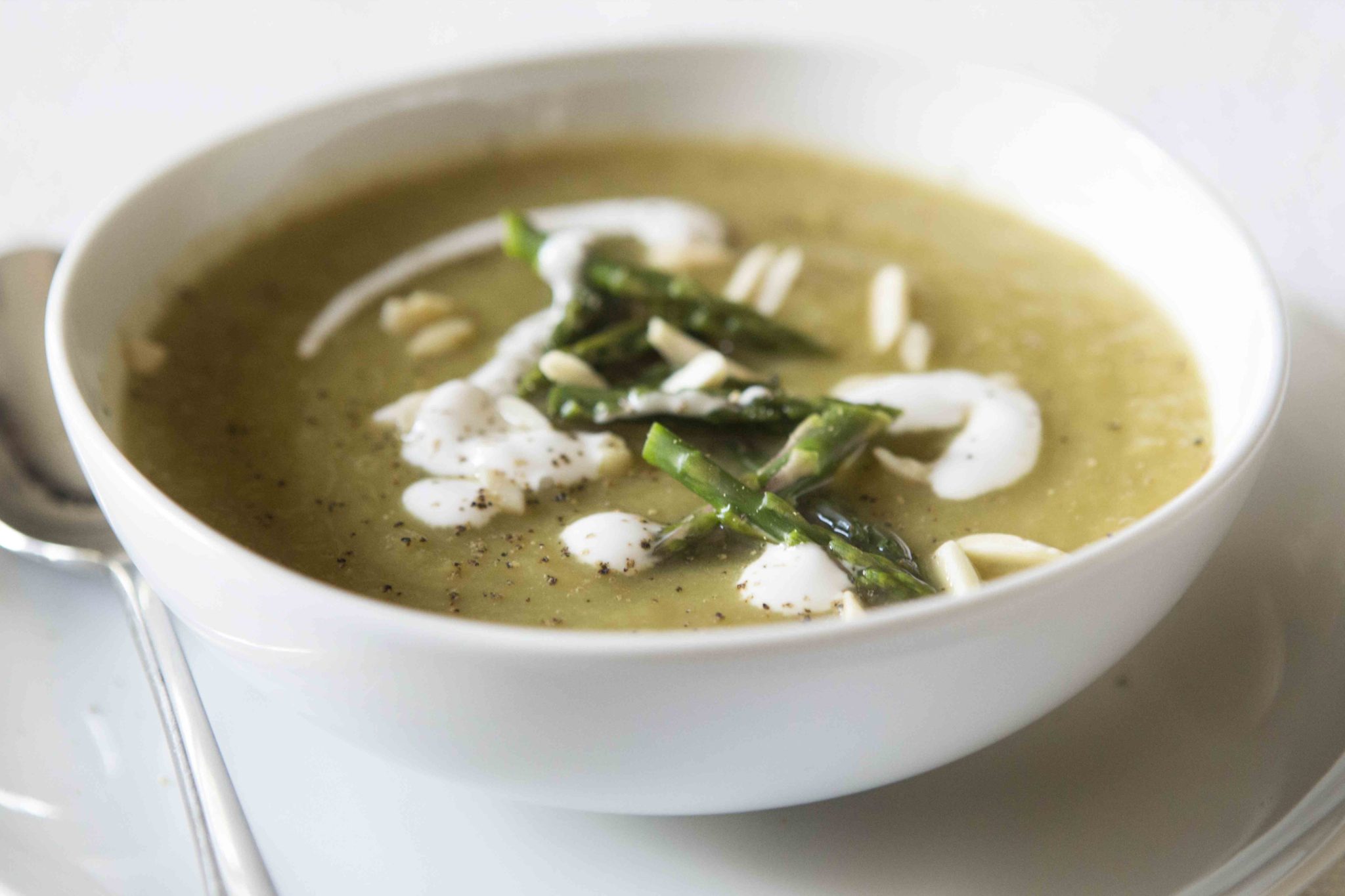 Garnish with a drizzle of coconut milk, asparagus tips, and almond slivers.